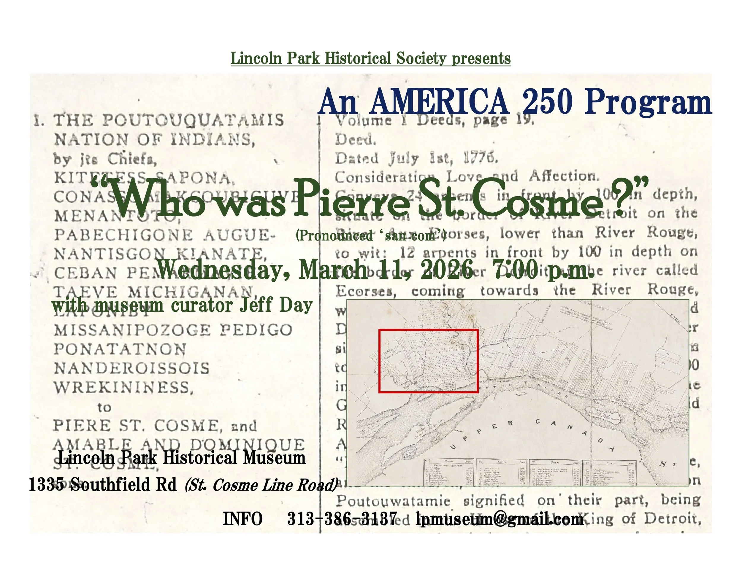 You are invited to attend the presentation and discussion on the year 1776 at Detroit, entitled "Who was Pierre St. Cosme?" with a focus on the property of land gifted from the Potawatomi to St. Cosme, one of the French-Canadian community living at Detroit in the 1700s. The property deed was signed by the chiefs of the Potawatomi on July 1, 1776, coincident to the adoption and signing of the Declaration of Independence in the American colonies.